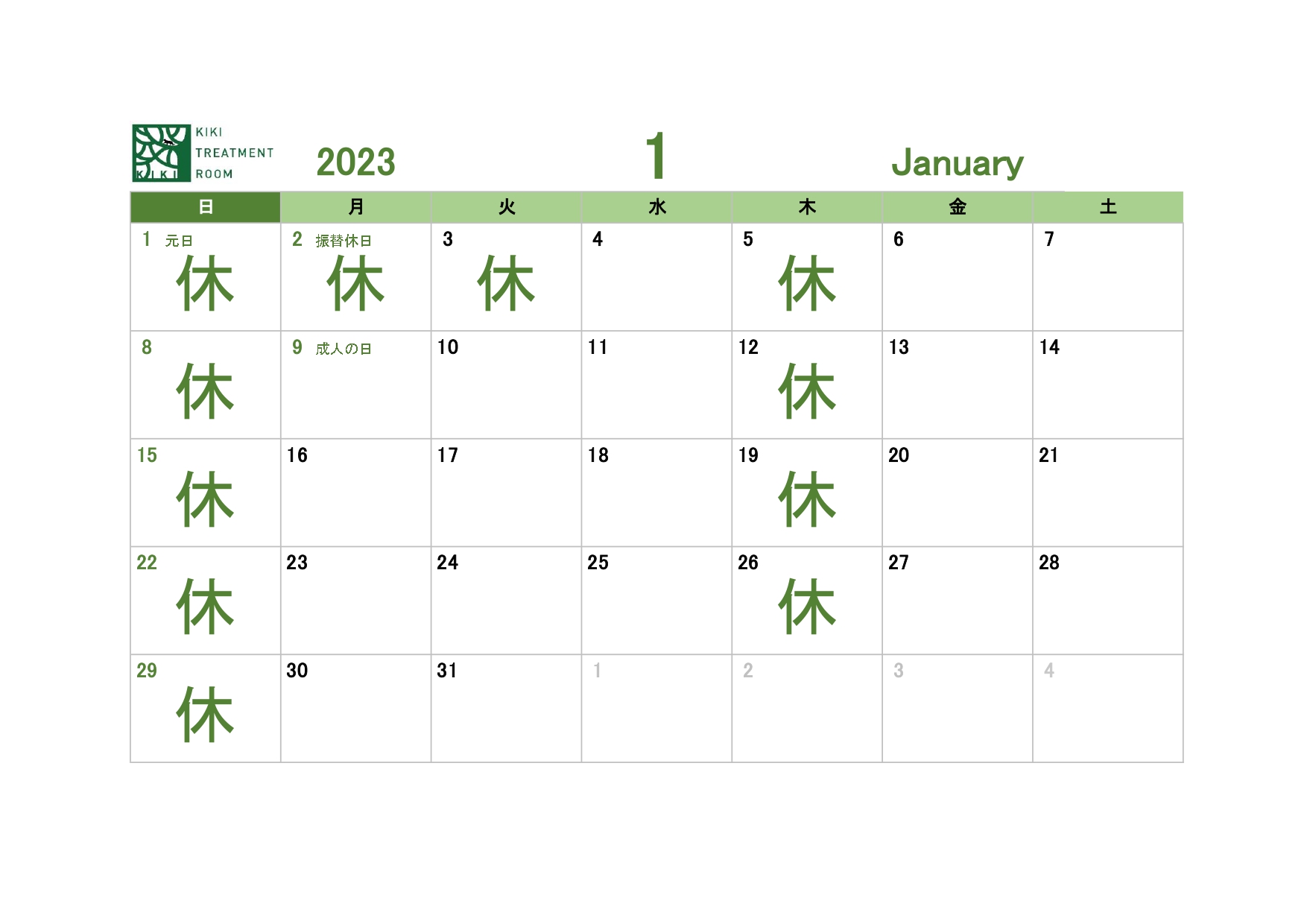 2023年1月営業日のお知らせ